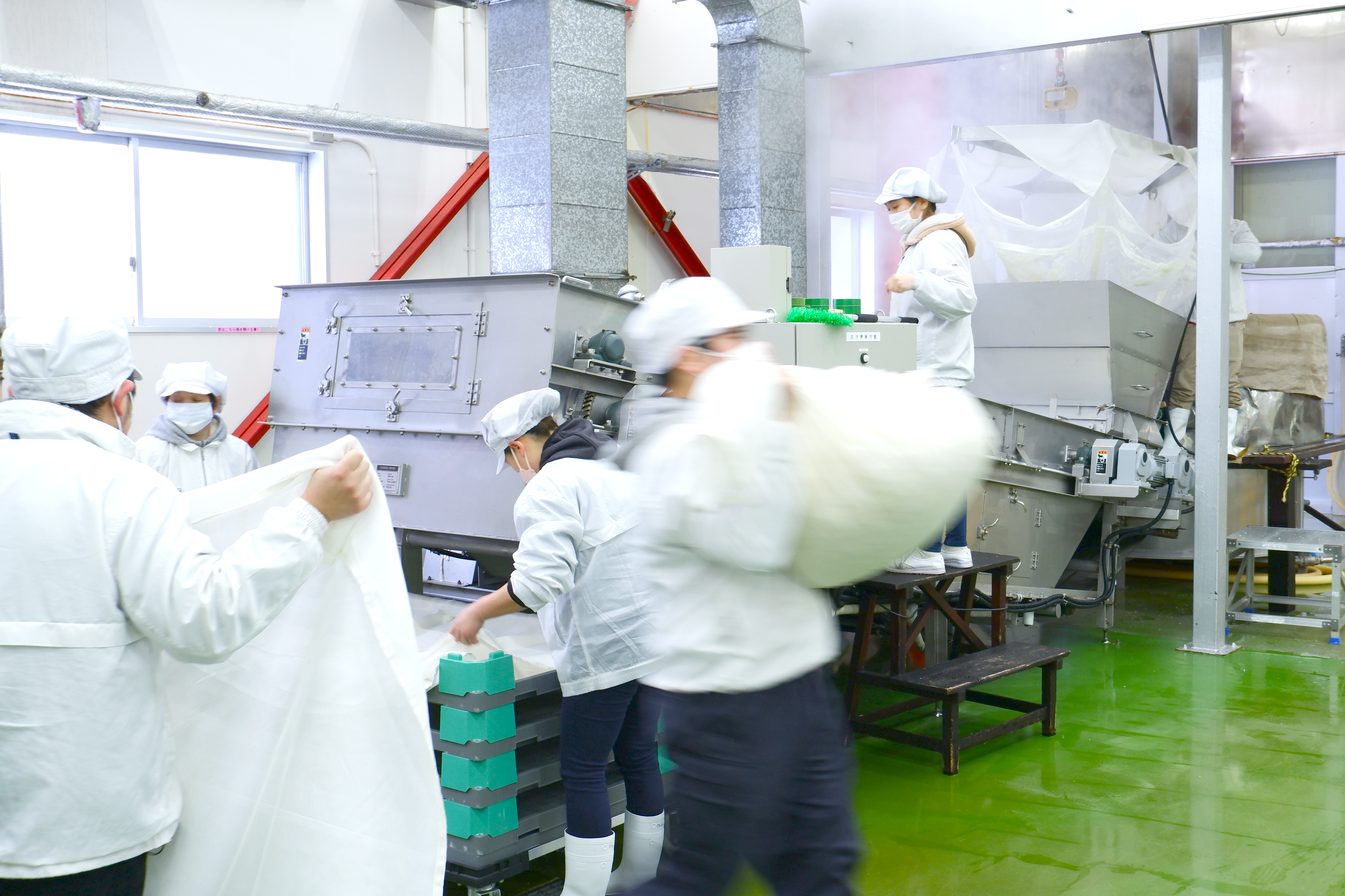 麹室まで最適な状態でお米を届けるため、声を掛け合いながら手早く作業を進めていきます。