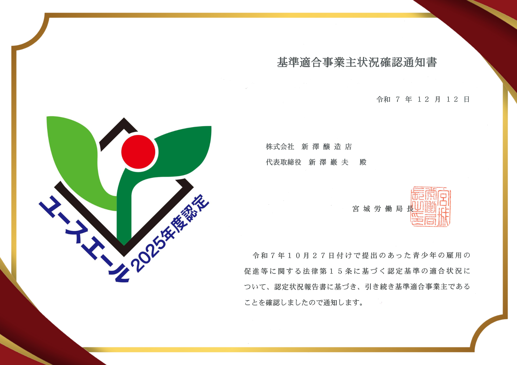「ユースエール認定企業(ホワイト企業)」として、本年も認定を頂戴いたしました。